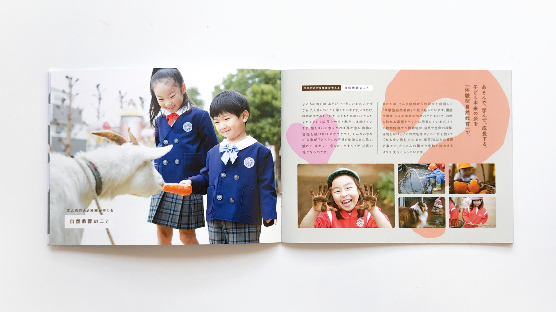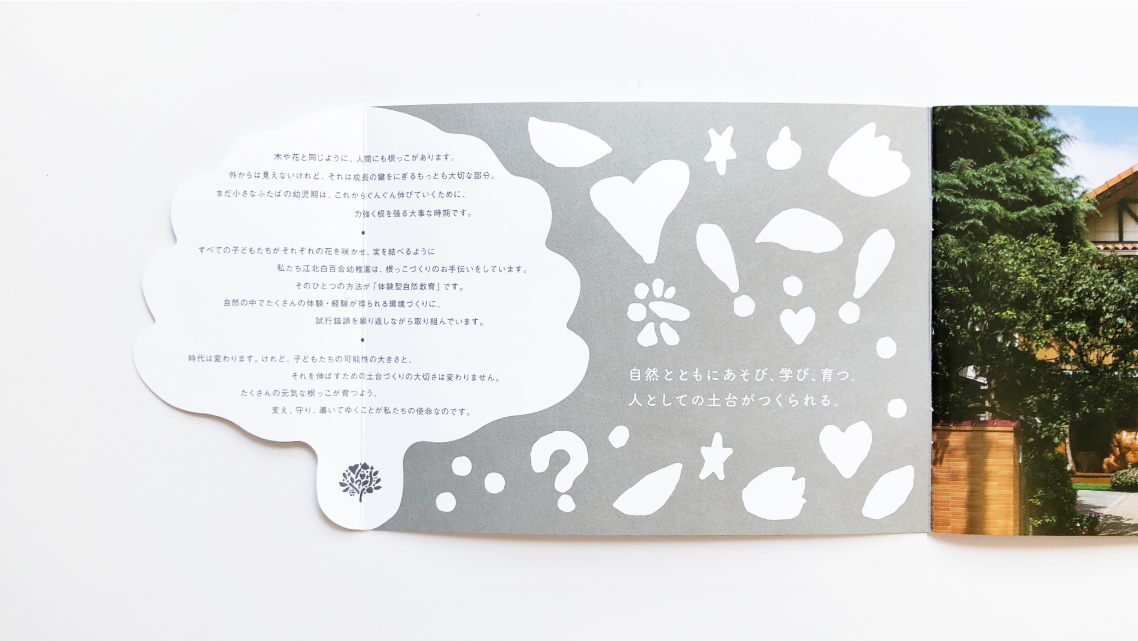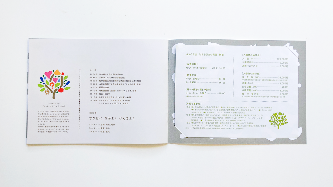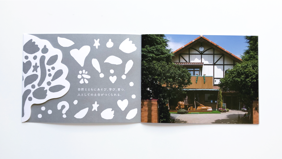 前回のデザインを継承しながら、表紙をめくるとメッセージがでる仕掛けを設けるなど「遊び心」あるパンフレットになりました。