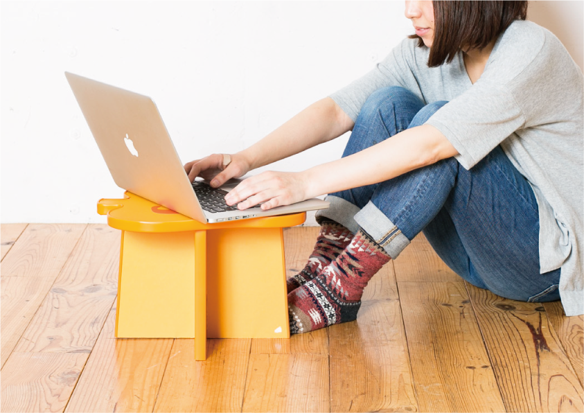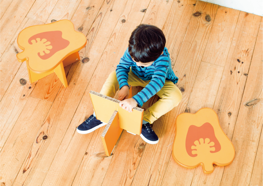 強化ダンボール資材Re-board(リボード)という資材を使った。野菜型の子供用スツールです。「頑丈なのに軽い」「簡単な成形・加工」「高い印刷適性」という特性を生かした、ペーパークラフトのように組み立てる仕組み。丸い座面とクロスした脚部からなるフォルムから、◯×STOOLと名付けました。 ※現在は販売しておりません