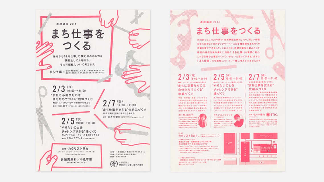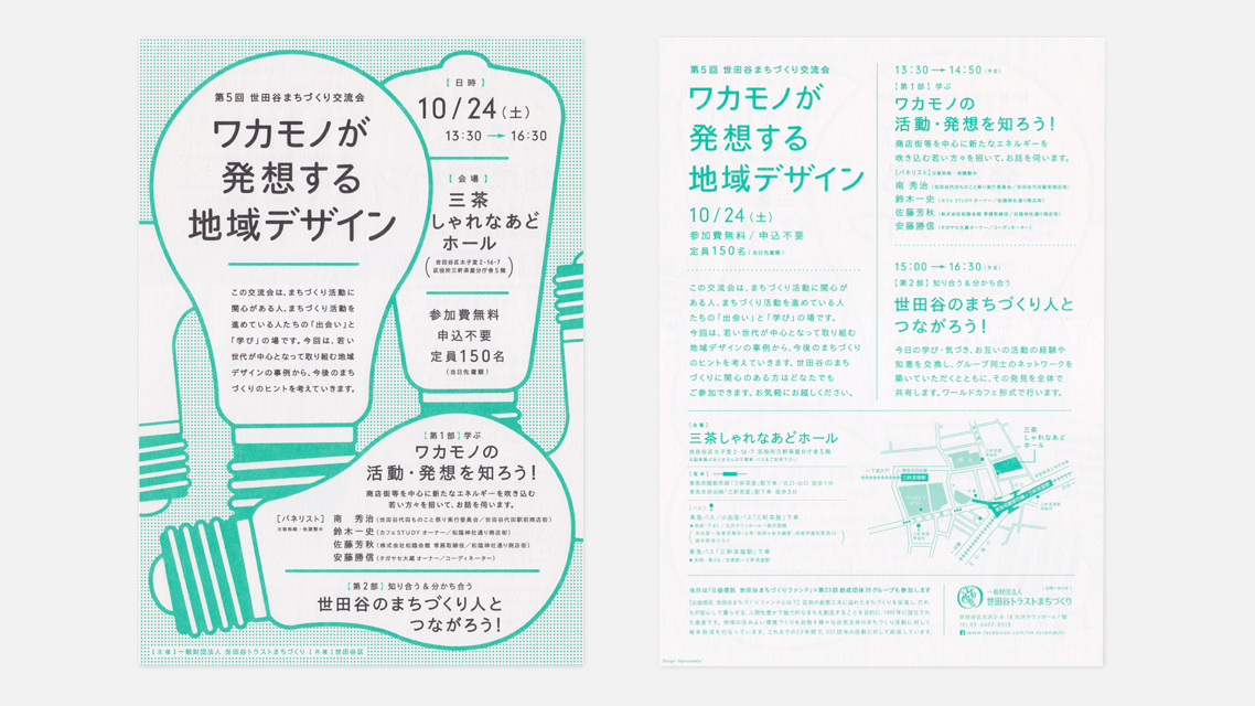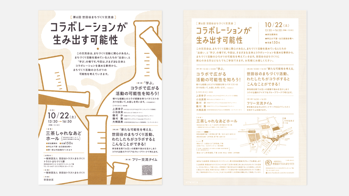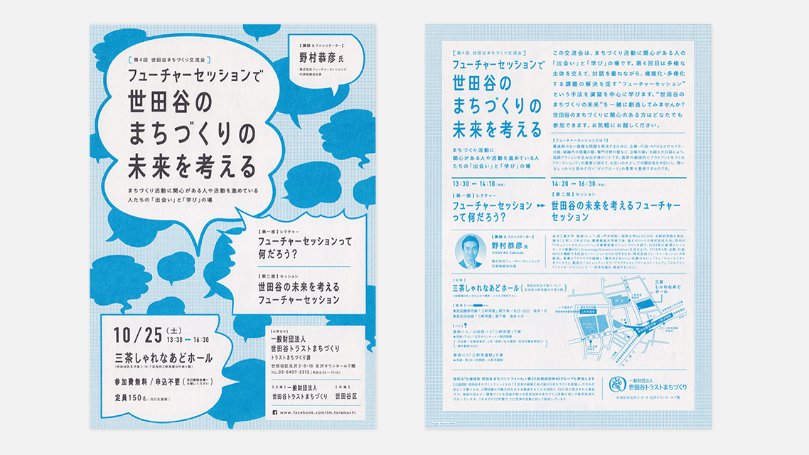 世田谷トラストまちづくり主催のイベントのチラシ。用紙にハーフエアを使用し手にとったときの心地よさにこだわりました。シリーズ化にあたって、毎回タイトルを製作、ブラックと特色という配色ルールを設定して統一感を出すなどで集めた時の楽しさを狙いました。