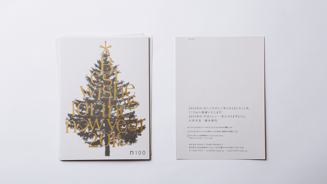 ファッションブランド、n100(エヌ・ワンハンドレット)のクリスマスカード。 メッセージをクリスマスツリーのオーナメントに見立てたタイポグラフィにし、 マットゴールドの箔押しで表現しました。
